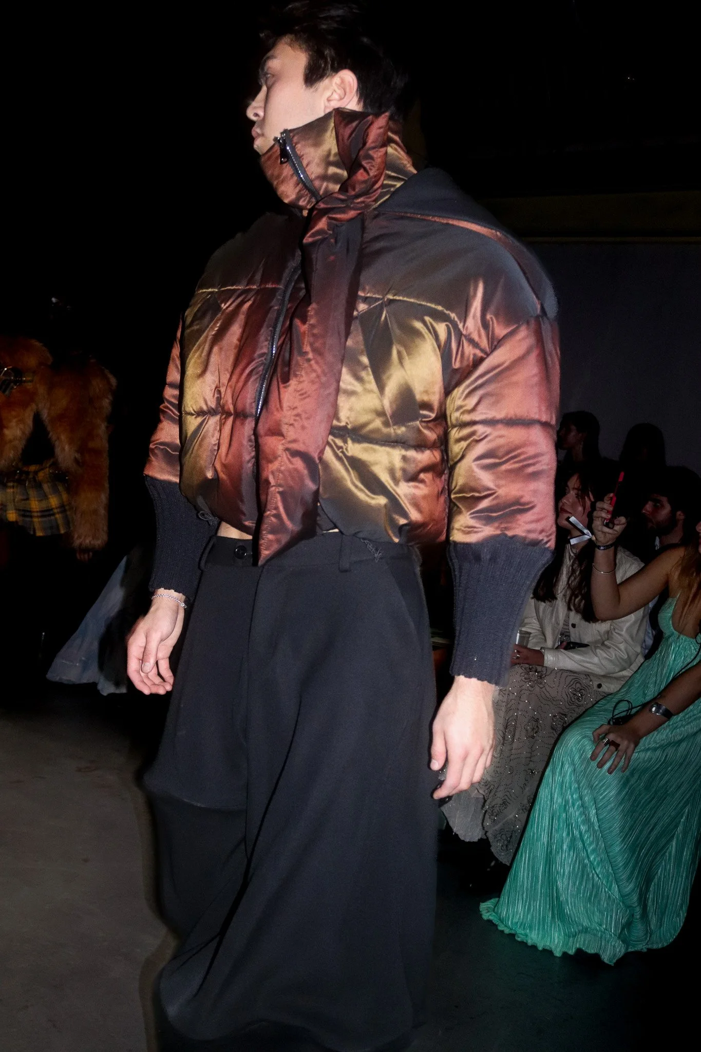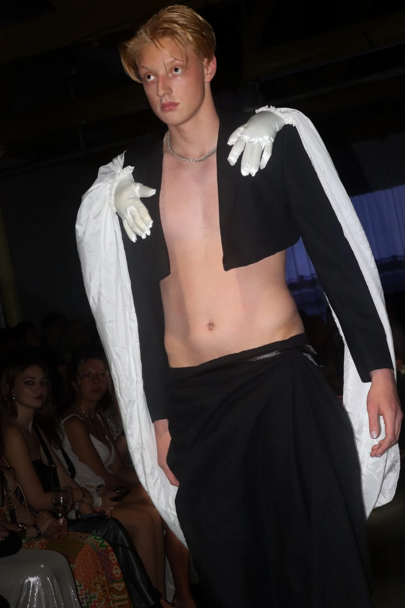 J: The soft siren-like entrance of the first models in sheer fabrics, with white structural dresses creased and folded in ways to look like sea foam, and subtle pastel tones moving quietly across the stage looked like figures walking straight out of Greek mythology. W: While the blue, green, and purple lights of the room played off the fabric, creating what seemed like a splashing rhythm of waves upon white sand. Donning dresses of netting and mesh, and with hair still wet from a journey through the sea, the entire showroom felt like a world operating just above the water’s surface. The rhythmic music and seascape backdrop only enhanced this feeling. J: And as the models walked past each other as distant partners hoping to be reunited, we were reminded again of the longing which underlies Odysseus’s journey. N: The models seem to have become both the traveller, the obstacles, and the temptations that they would encounter along the journey.